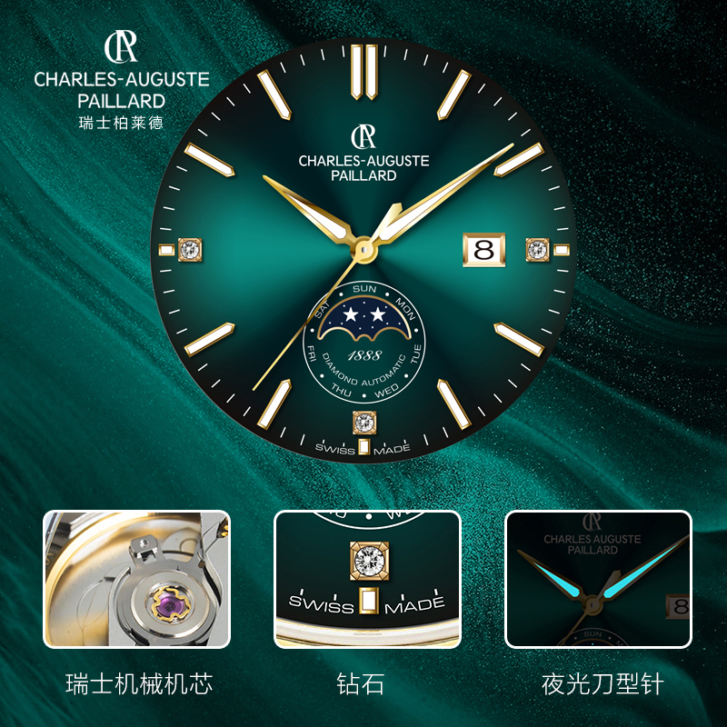 功能瑞士原装进口机芯,自动上链机械机芯,每小时振动28,800次,提供约38小时动力储存