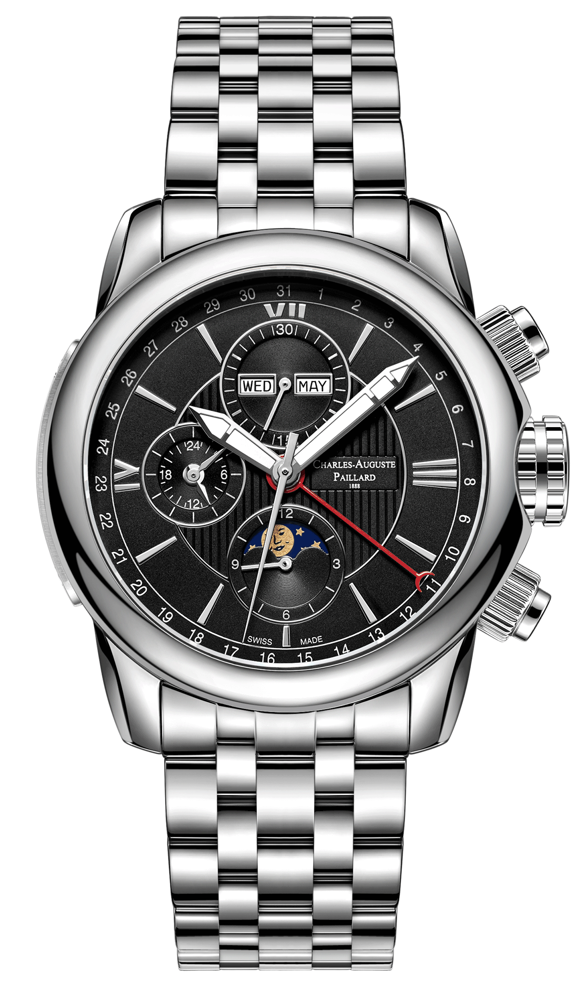 运行时标时、分、小秒盘、日期、星期、月、月相、24小时,计时显示